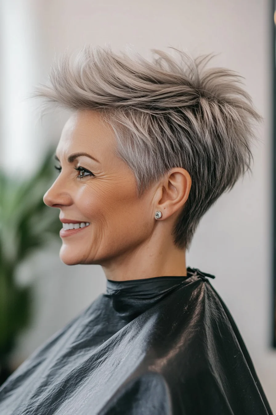 This pixie cut is all about volume and texture. Feathered layers create a soft, airy look that works beautifully with thin or fine hair. The layers add movement, making it ideal for those with a round face. Opt for a soft ash blonde or silver to enhance the dimension.