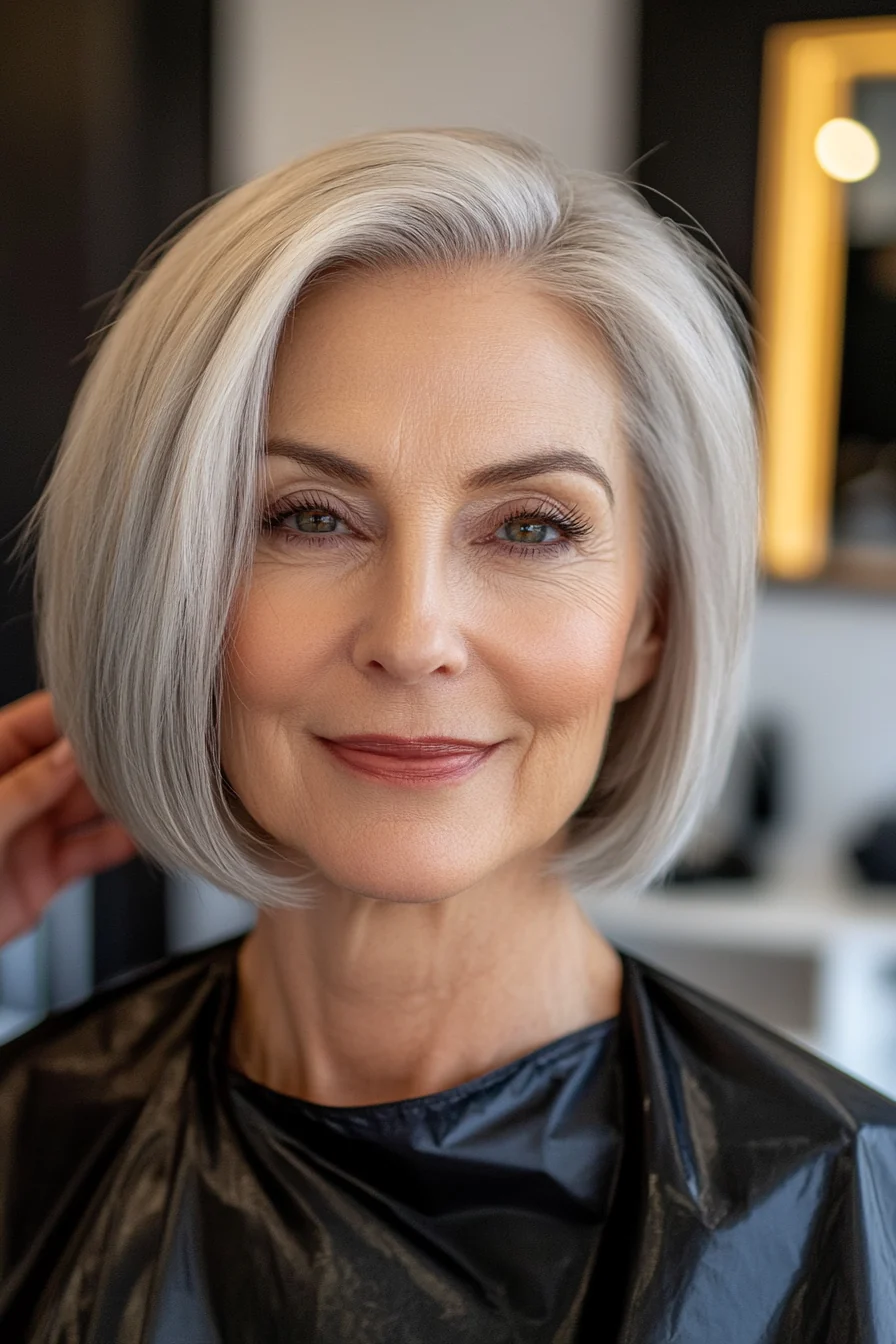The concave bob, with its shorter back and longer front, creates a striking silhouette. Graduated layers give the hair movement, making it a great choice for those with fine hair. A cool-toned silver or ash blonde enhances the modern feel of this cut.