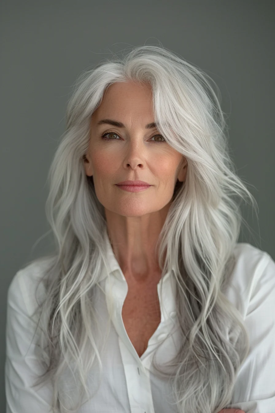 Embrace your natural gray hair with long layers that add movement and texture. This style is low maintenance and highlights the beauty of gray hair.
