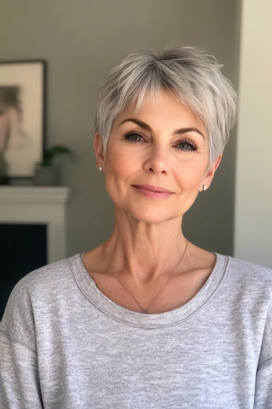 This pixie cut, with short layers around the crown, enhances volume. The cool silver tone gives an edgy, modern look that works with natural grays.